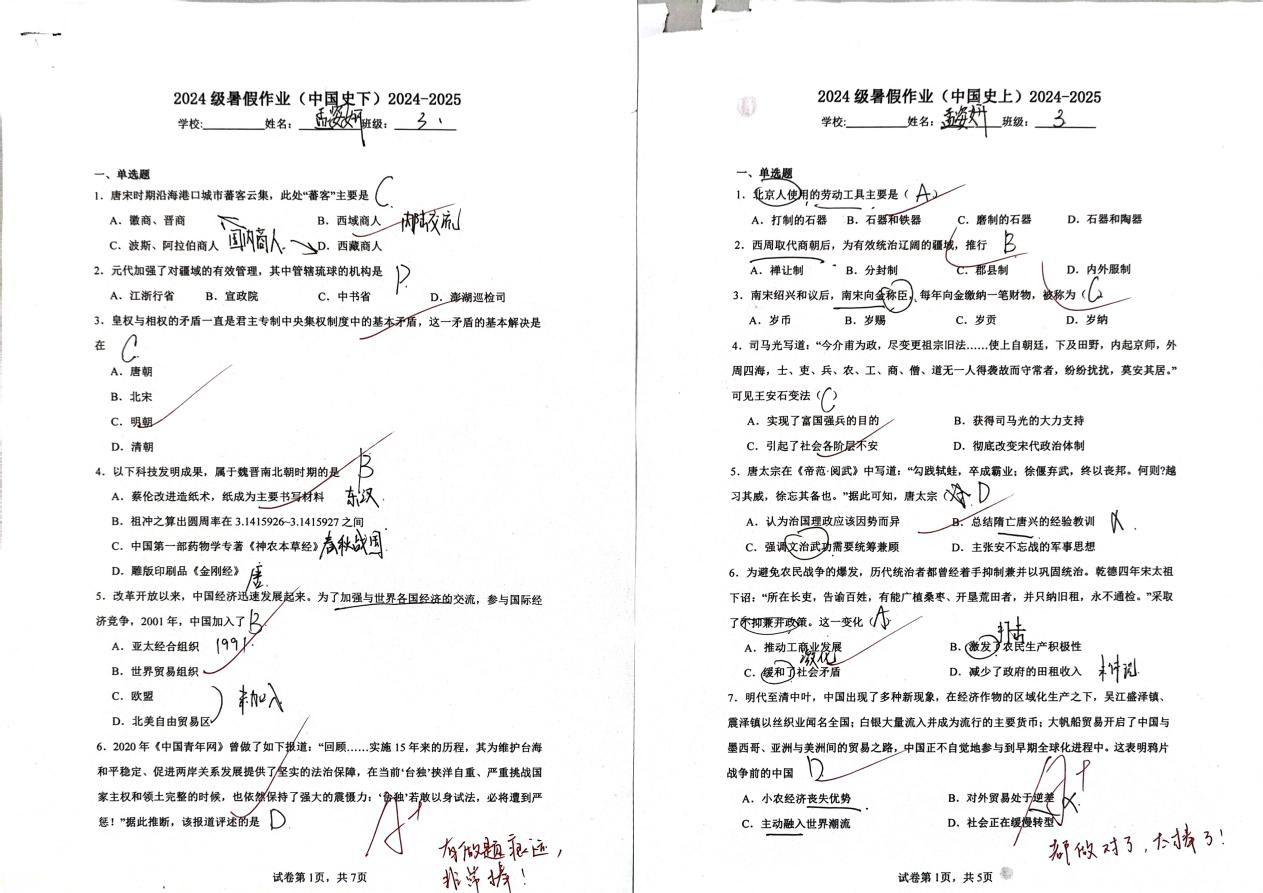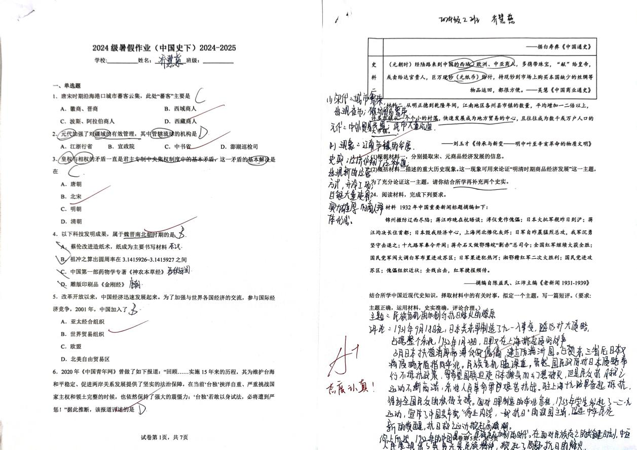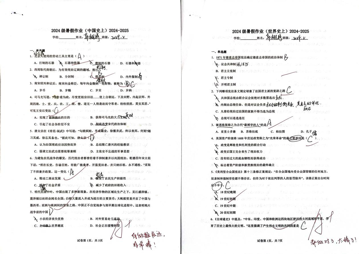 本次暑期历史作业设计注重基础与拓展相结合,通过综合性练习与实践型任务,帮助同学们在假期中保持学习的连贯性。引导同学们通过丰富的形式增强对历史的整体感知和系统理解,实现知识的有机整合与历史素养的稳步提升,有效激发了同学们的历史兴趣,促进了批判性思维与自主学习能力的发展,为后续学习奠定了扎实基础。
