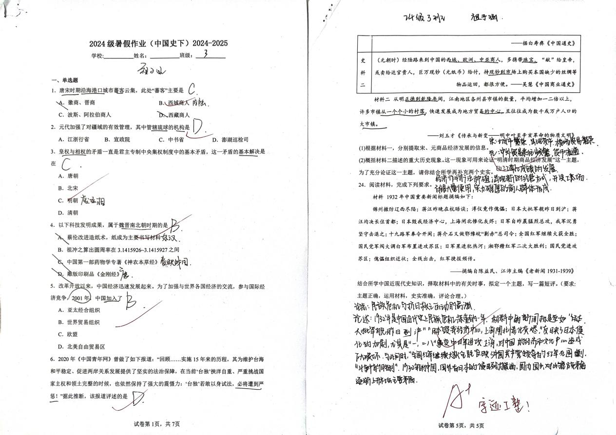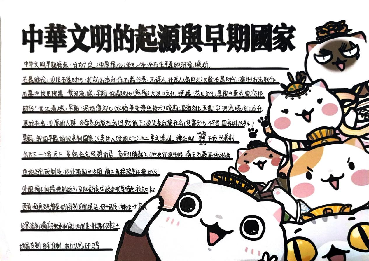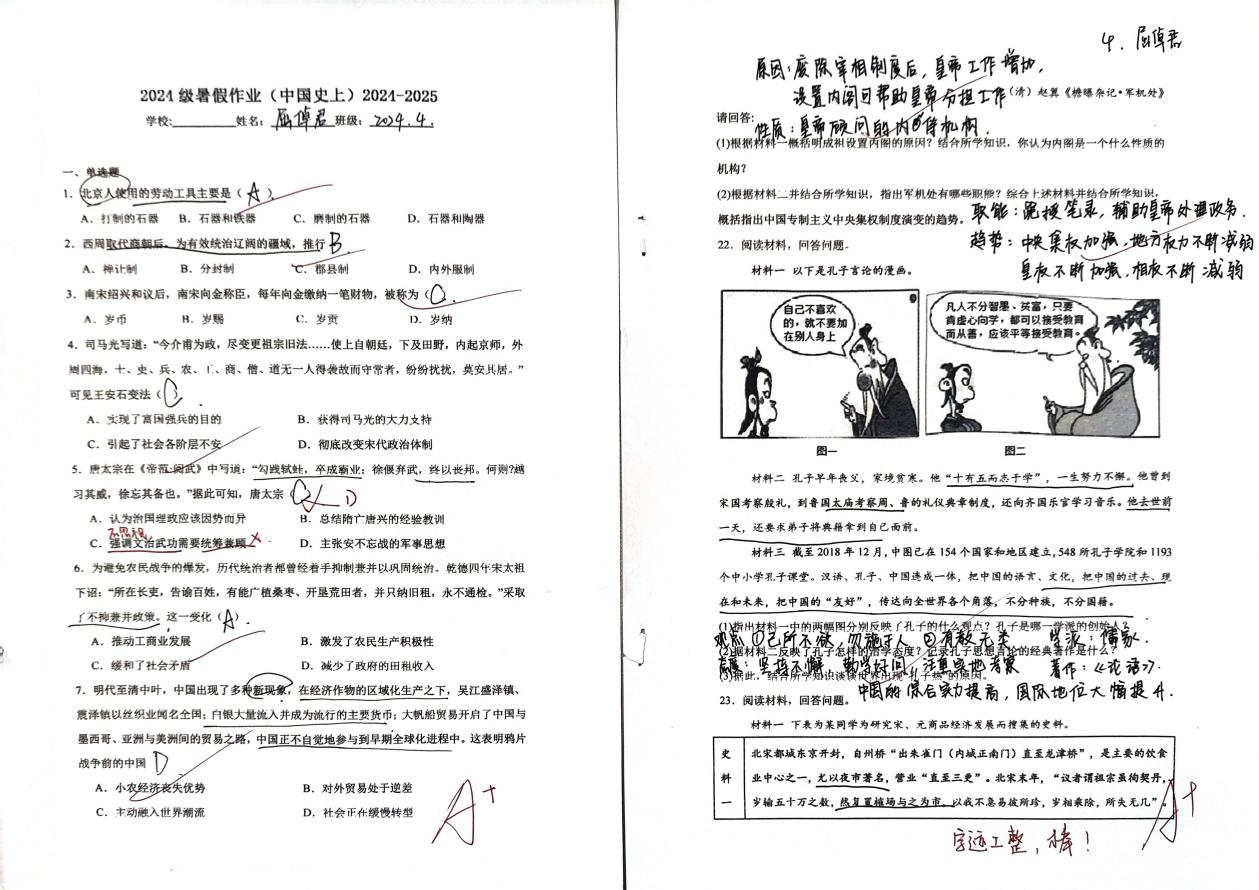 本次暑期历史作业设计注重基础与拓展相结合,通过综合性练习与实践型任务,帮助同学们在假期中保持学习的连贯性。引导同学们通过丰富的形式增强对历史的整体感知和系统理解,实现知识的有机整合与历史素养的稳步提升,有效激发了同学们的历史兴趣,促进了批判性思维与自主学习能力的发展,为后续学习奠定了扎实基础。