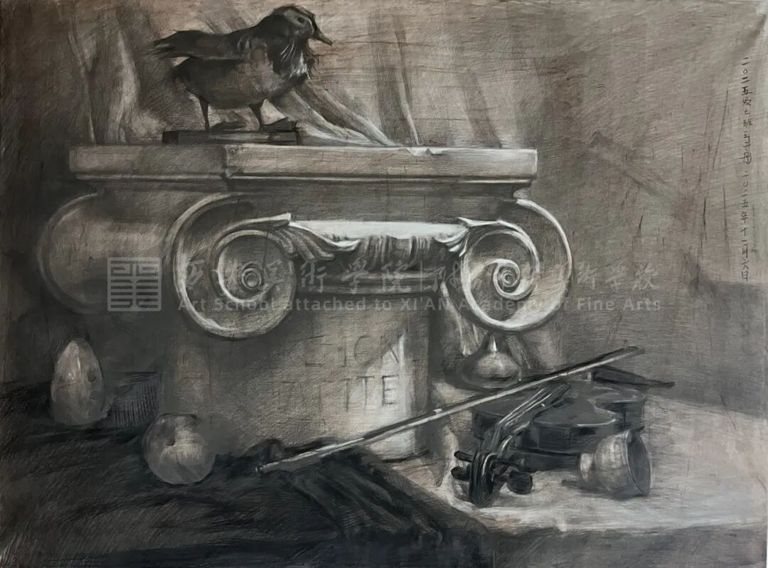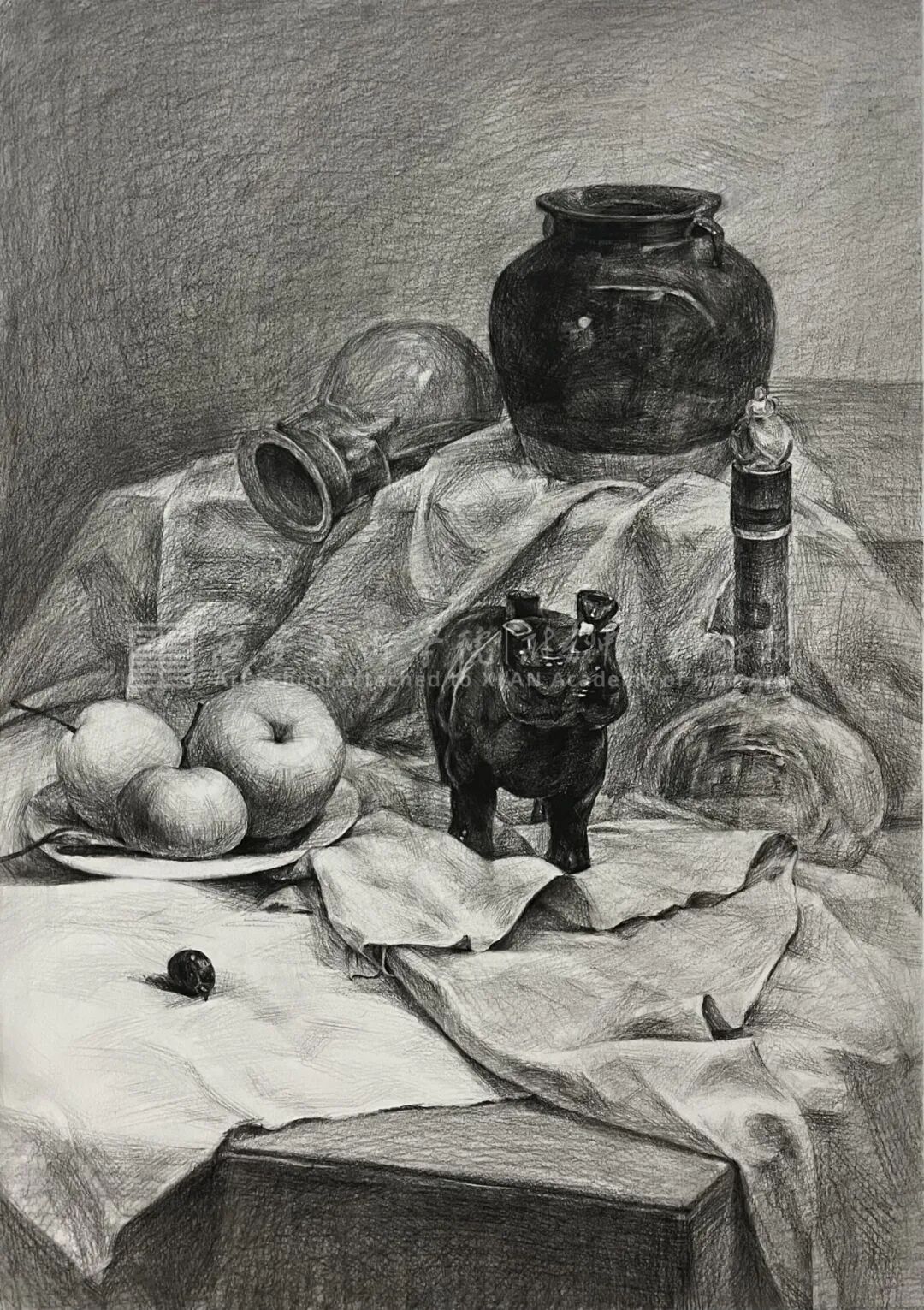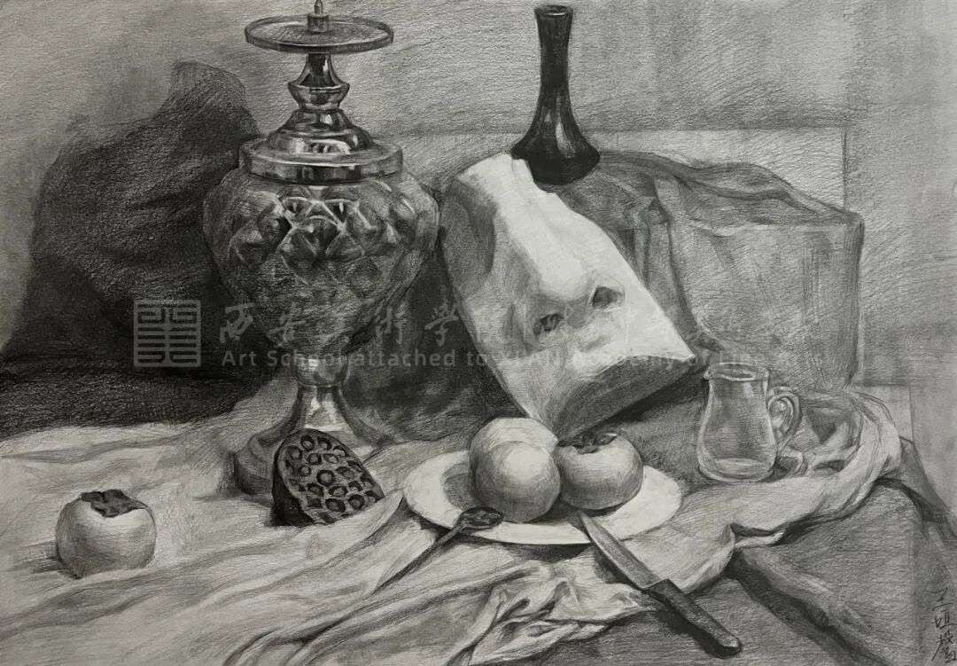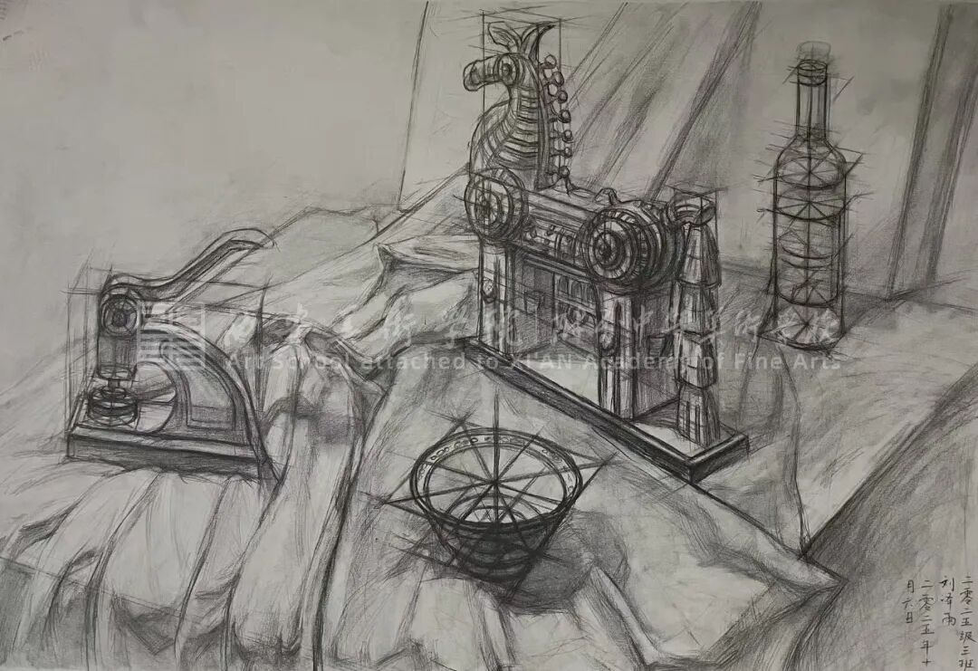 课程第一阶段以结构素描表现为主,重点训练学生将几何解析与透视知识运用于静物结构表现,强化对物体内在构造与空间关系的理性认知。进入第二阶段全因素素描写生后,教学重点转向整体画面的经营与把控,包括构图组织、黑白灰布局、虚实节奏处理,以及不同质感的深入刻画。在实践过程中,我们始终强调“整体—局部—整体”的观察与表现方法,引导学生从被动描摹转向主动构建,在把握大关系的前提下进行局部塑造,使作品既有丰富细节又不失整体张力。