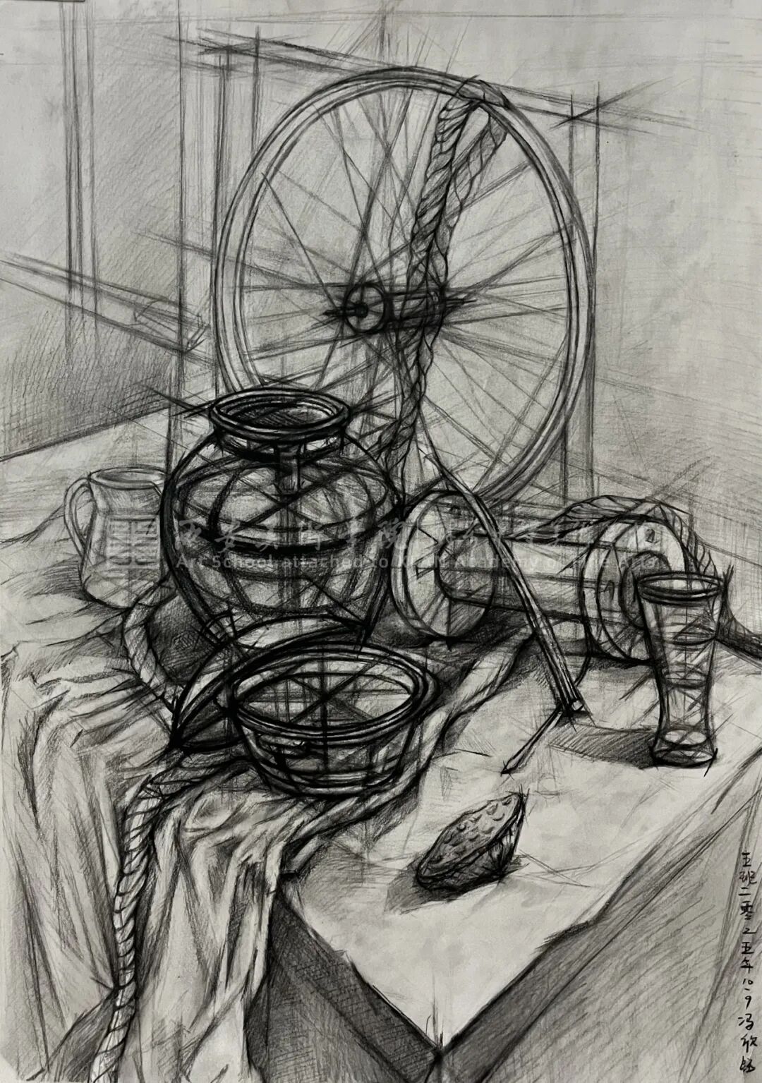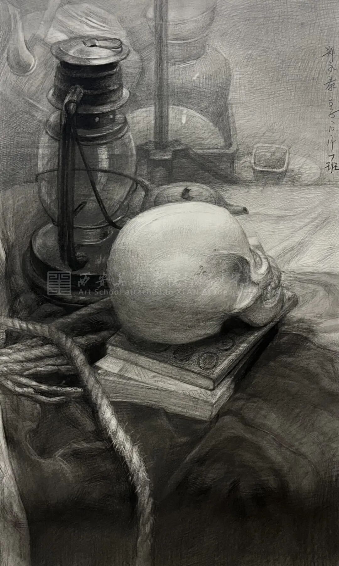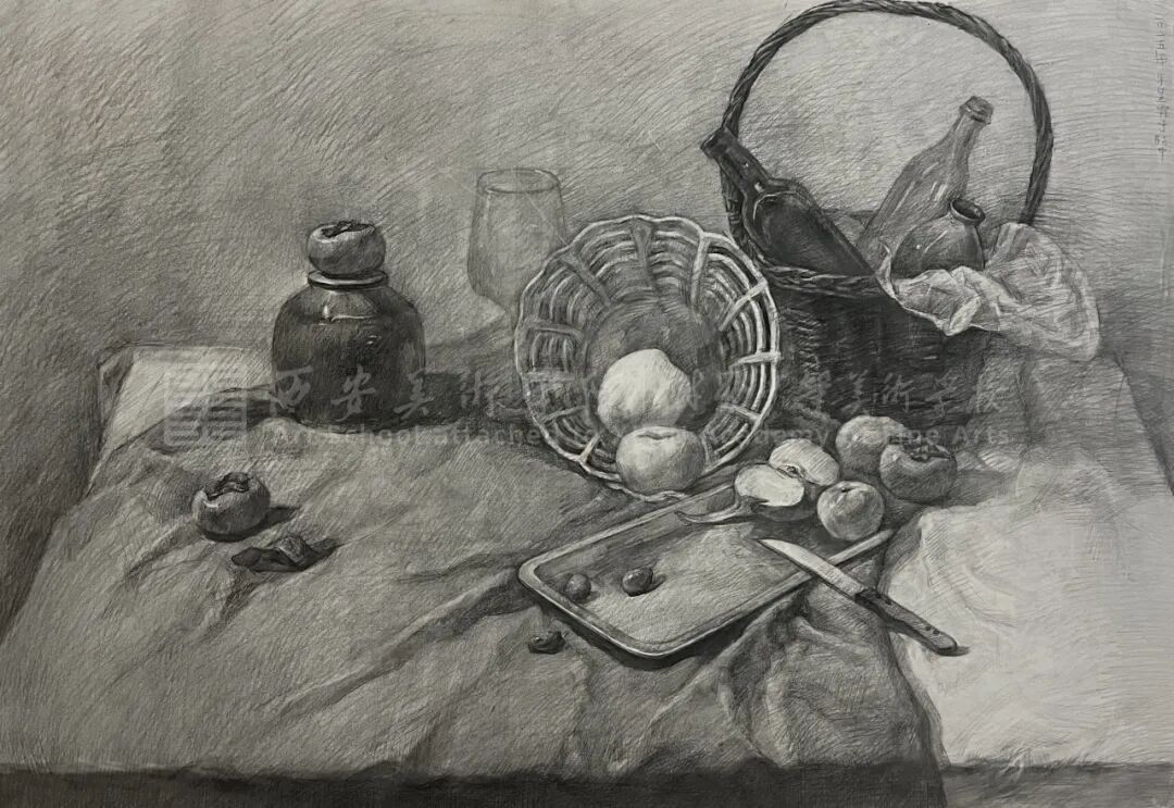课程第一阶段以结构素描表现为主,重点训练学生将几何解析与透视知识运用于静物结构表现,强化对物体内在构造与空间关系的理性认知。进入第二阶段全因素素描写生后,教学重点转向整体画面的经营与把控,包括构图组织、黑白灰布局、虚实节奏处理,以及不同质感的深入刻画。在实践过程中,我们始终强调“整体—局部—整体”的观察与表现方法,引导学生从被动描摹转向主动构建,在把握大关系的前提下进行局部塑造,使作品既有丰富细节又不失整体张力。