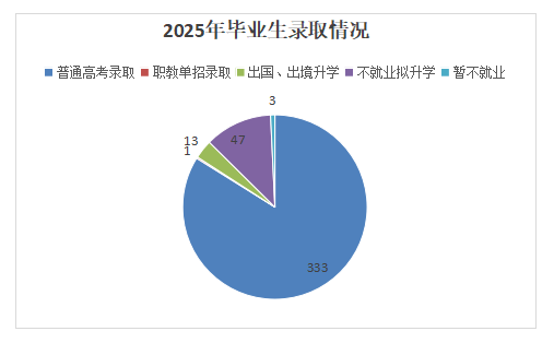2025年,我校毕业生397人,其中通过参加国内普通高考被艺术类院校录取333人,占比83.9%;出国、出境升学13人,占比3.3%;参加职教单招考试录取1人,占比0.3%;不就业拟升学47人,占比11.84%;暂不就业3人,占比0.75%。