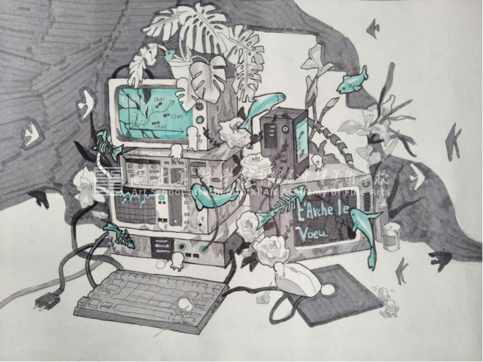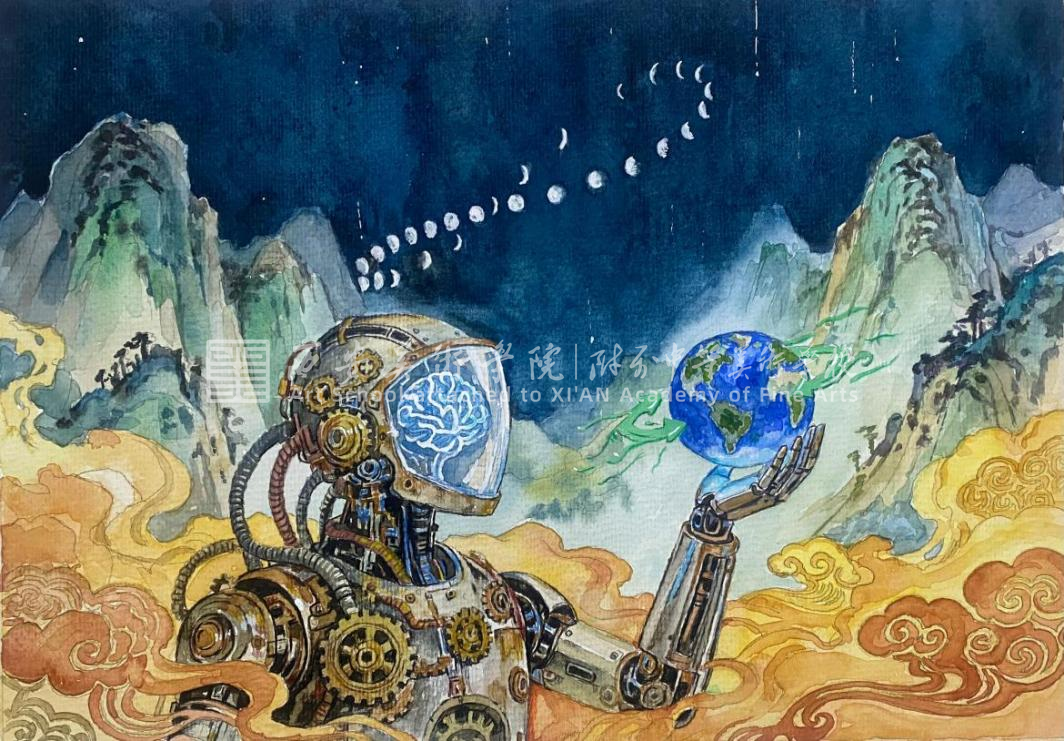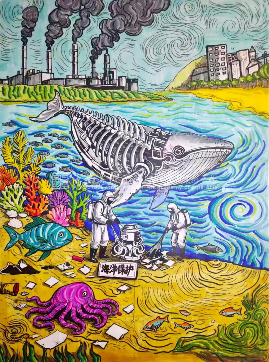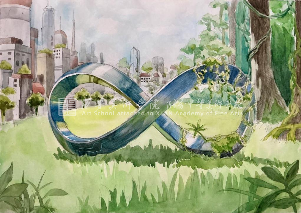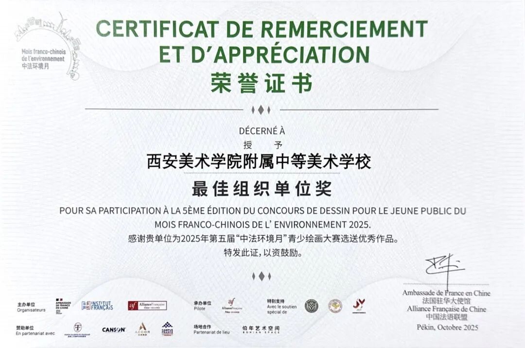 西安美术学院附属中等美术学校高度重视此次跨国艺术赛事,组建专业师生团队进行创作参赛,经过中法两国学术专家、文化界代表及艺术节资深人士组成的评审团层层遴选,我校26名学子凭借扎实的专业功底、新颖的创作视角与深刻的环保理念,在双赛道中脱颖而出。12幅学生作品斩获奖项:其中4幅作品获“中法环境月艺术大赛”优胜奖,8幅作品获“纪元2046超媒介艺术海选”星火潜力奖,教师团队获“灯塔守望导师奖”。3幅优秀作品受邀线下亮相北京语言大学中法人文交流空间中法友谊展厅,通过现场展览向中外观众展现中国青少年的环保担当与艺术风采。此外,附中因组织有序、成果丰硕,被授予此次大赛“最佳组织单位奖”“晨旭之志组织单位奖”。