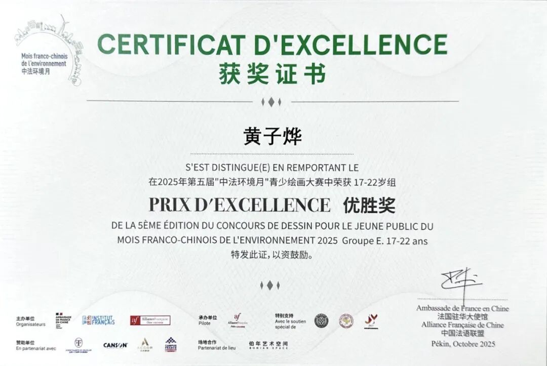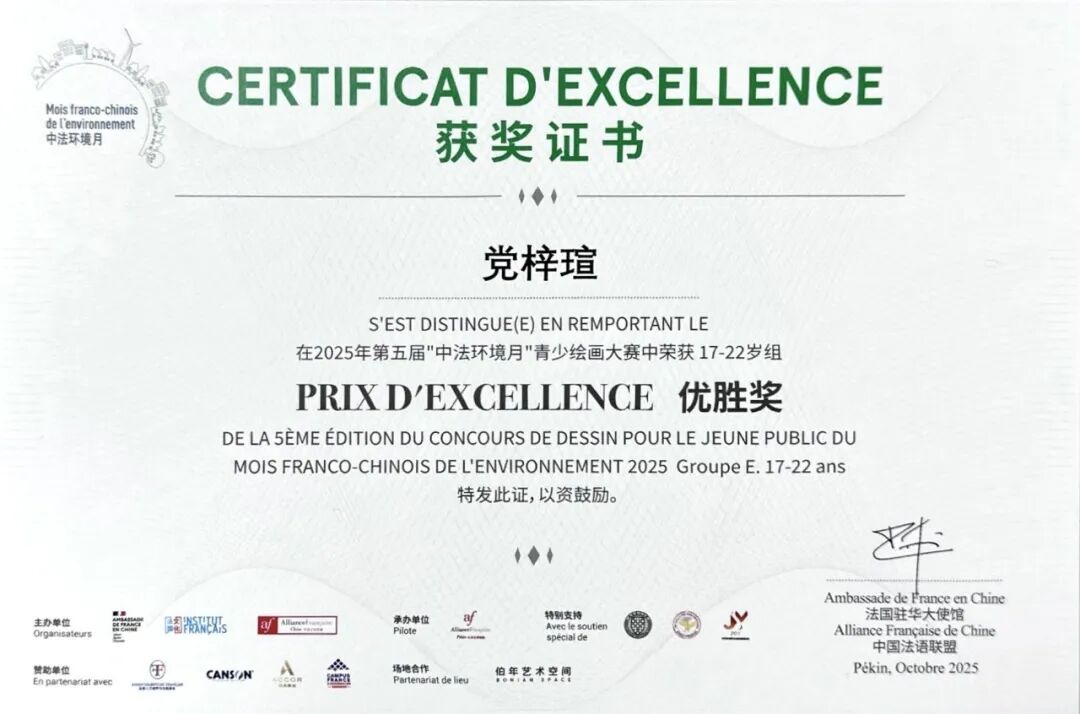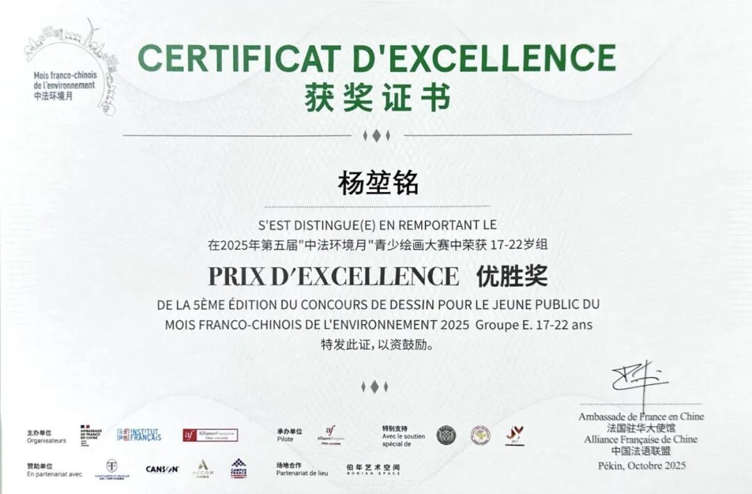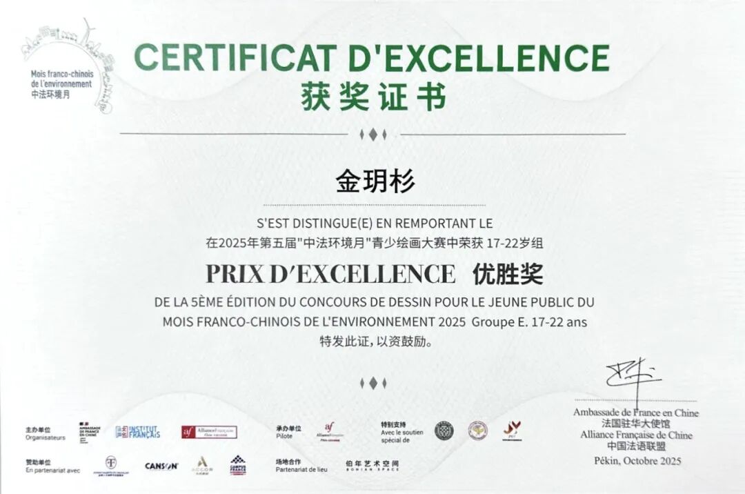 近日,由法国驻华大使馆与中国法语联盟联合发起主办的“中法环境月青少年绘画大赛”与“纪元 2046 超媒介艺术海选”落下帷幕。作为中法环境月(2014 年创立)的核心板块,该赛事是唯一由外国驻华使馆在中国多城举办的环境主题跨学科活动节,以“蔚蓝星球,绿动未来”为核心主题,面向17-22周岁青少年搭建起国际化艺术交流平台,旨在以艺术为桥唤醒青年一代的环境保护意识。