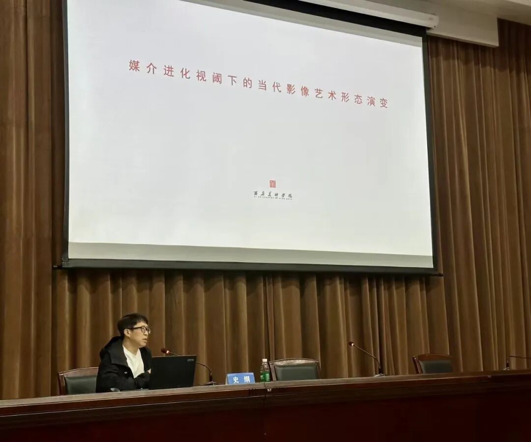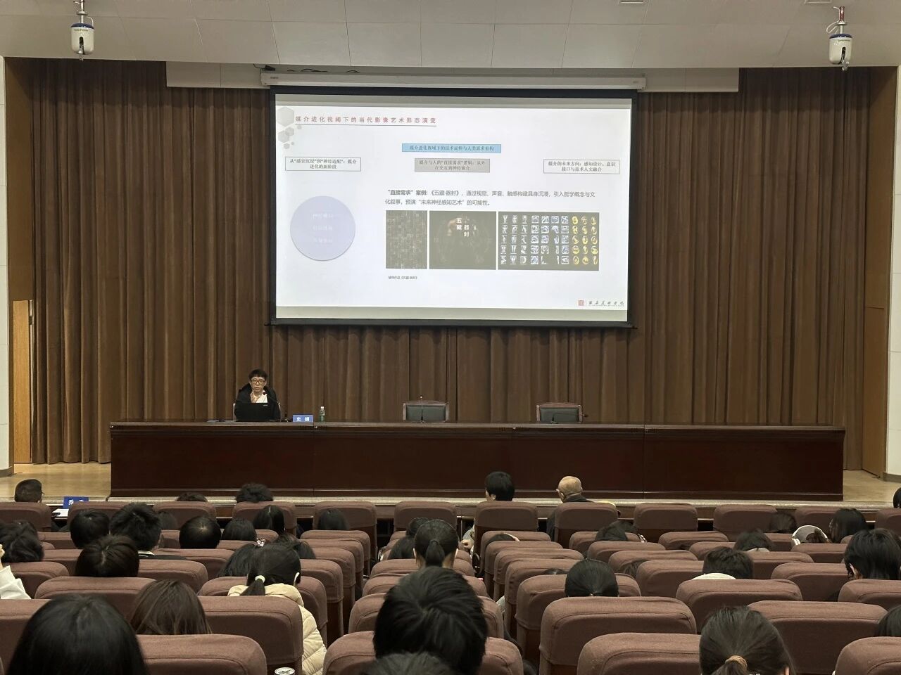史纲教授以媒介进化理论为视角,系统讲解了当代艺术形态演变脉络。以媒介环境学理论为基础,阐释艺术媒介从满足人类需求向人性化趋势进化的规律。史纲教授结合绘画、摄影、电影、数字艺术等案例,阐明媒介技术对艺术创作、传播与接受的深层影响,强调数字时代影像艺术呈现大众化、虚拟化、交互化特征。艺术媒介与呈现效果的变革,始终是人的需求与技术可能性共同书写的双重叙事。同时展望未来,艺术将向 AI、VR、元宇宙等领域延伸,走向跨媒介、跨学科深度融合,为艺术创新与人媒共生提供新路径与新方向。当下艺术家应始终保持对新兴科技的敏锐关注,以开阔的视野拥抱技术变革,唯有如此方能在媒介演进中把握创作主动权。在讲座互动环节,现场气氛热烈,同学们围绕人工智能对艺术创作的影响、跨媒介学习中传统技法的定位等问题踊跃提问,史纲教授结合自身创作与教学经验逐一解答,并鼓励同学们打破学科壁垒,在拥抱新技术的同时不丢失艺术的人文内核。