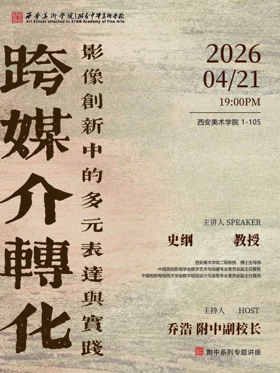 2026年4月21日晚,附中特邀西安美术学院影视动画系史纲教授,为师生带来题为《跨媒介转化:影像创新中的多元表达与实践》的专题讲座。讲座由附中副校长乔浩主持。