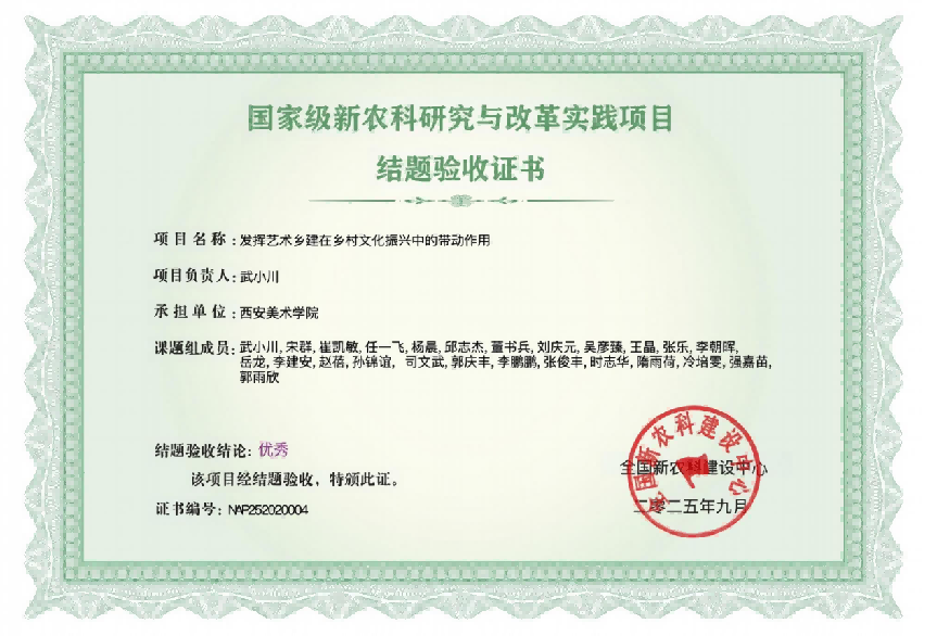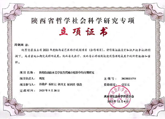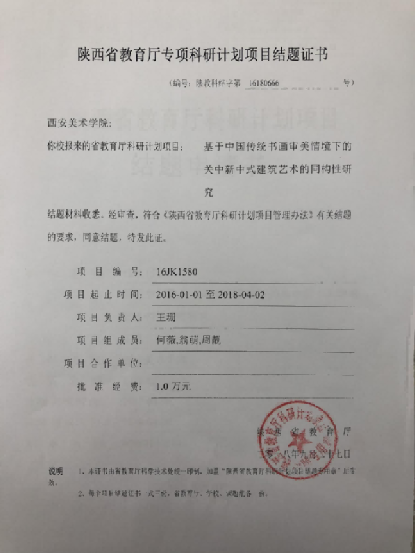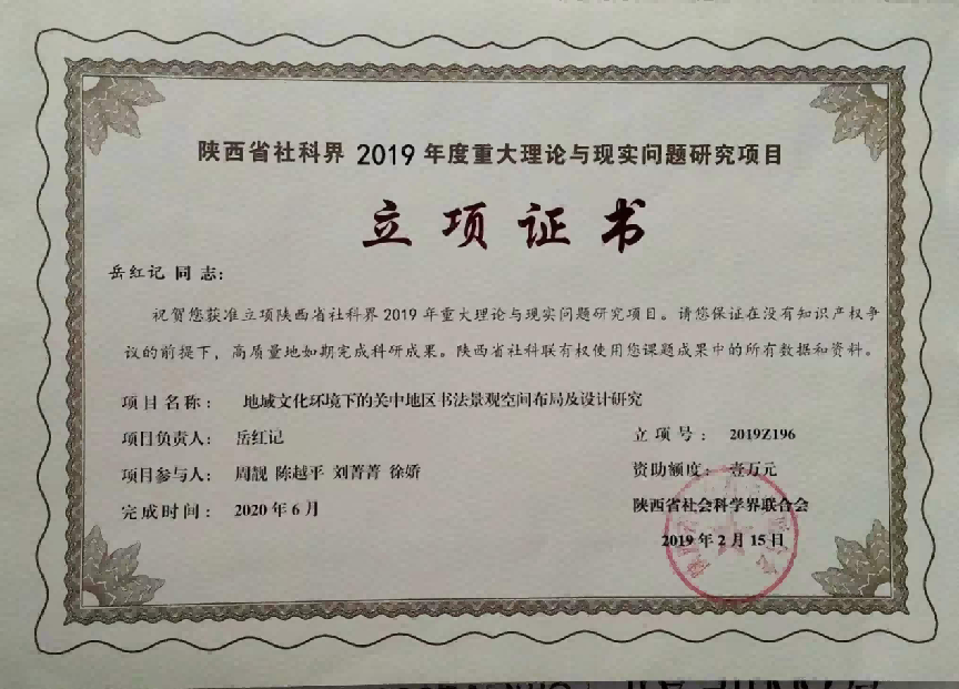 6.地域文化环境下的关中地区书法景观空间布局及设计研究立项证书(2019年)